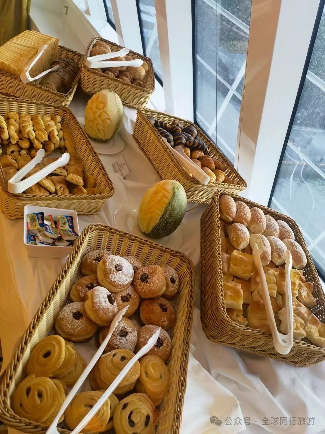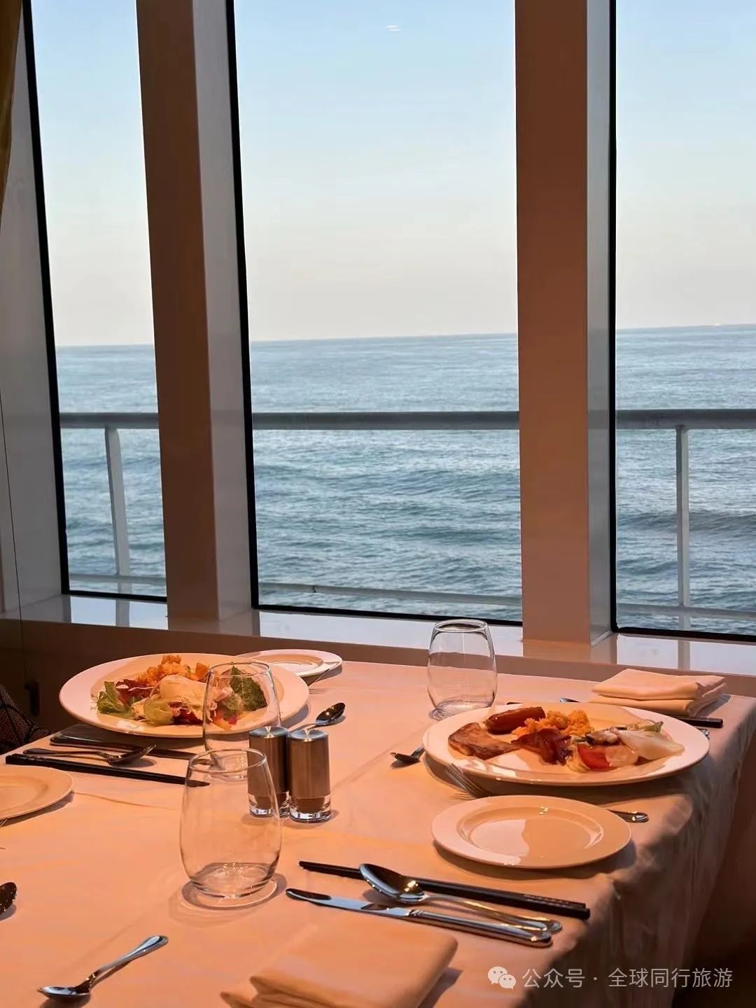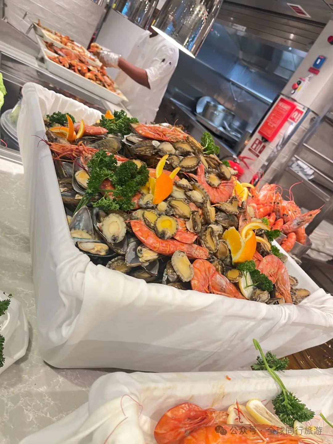 6、整理好房间的物品之后,大家就可以根据日报上的用餐时间,以及自己房卡上的用餐地点前往餐厅用餐啦,di一餐推荐大家去10楼的奇迹花园自助餐厅,餐厅空间大座位多,而且靠窗边可以看到海景哦,餐厅环境也很不错,自助餐想吃什么自己选,菜品很丰富。