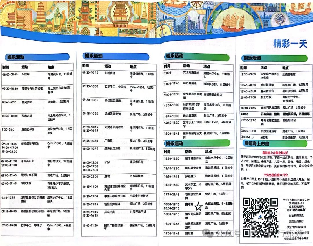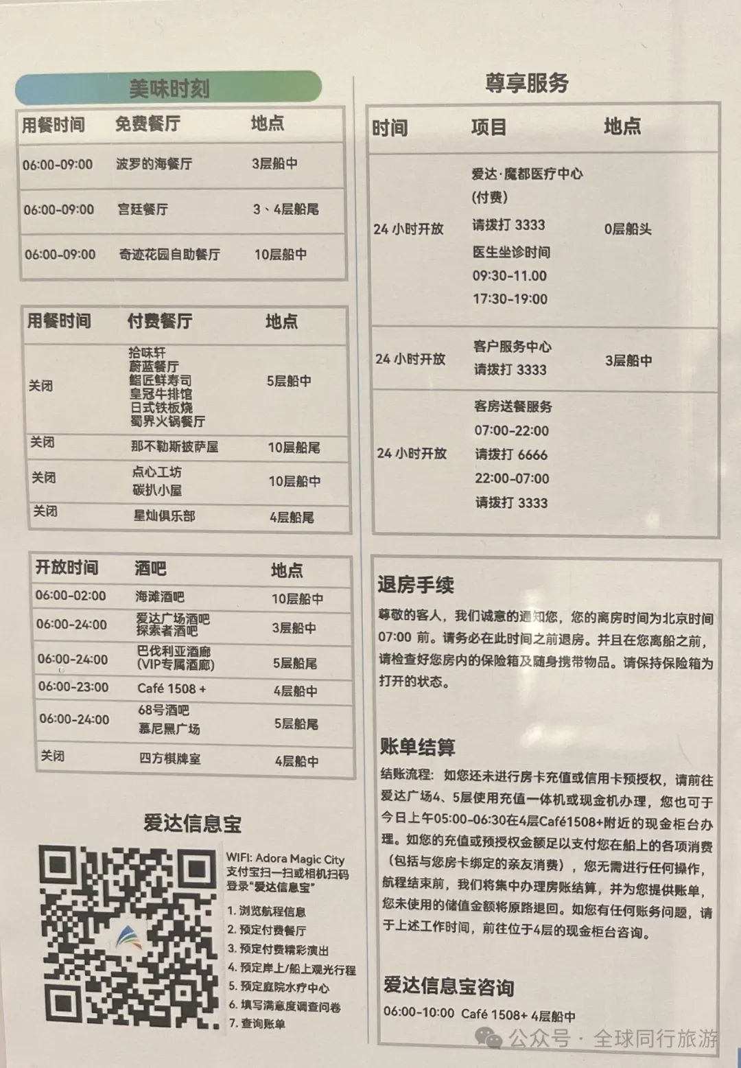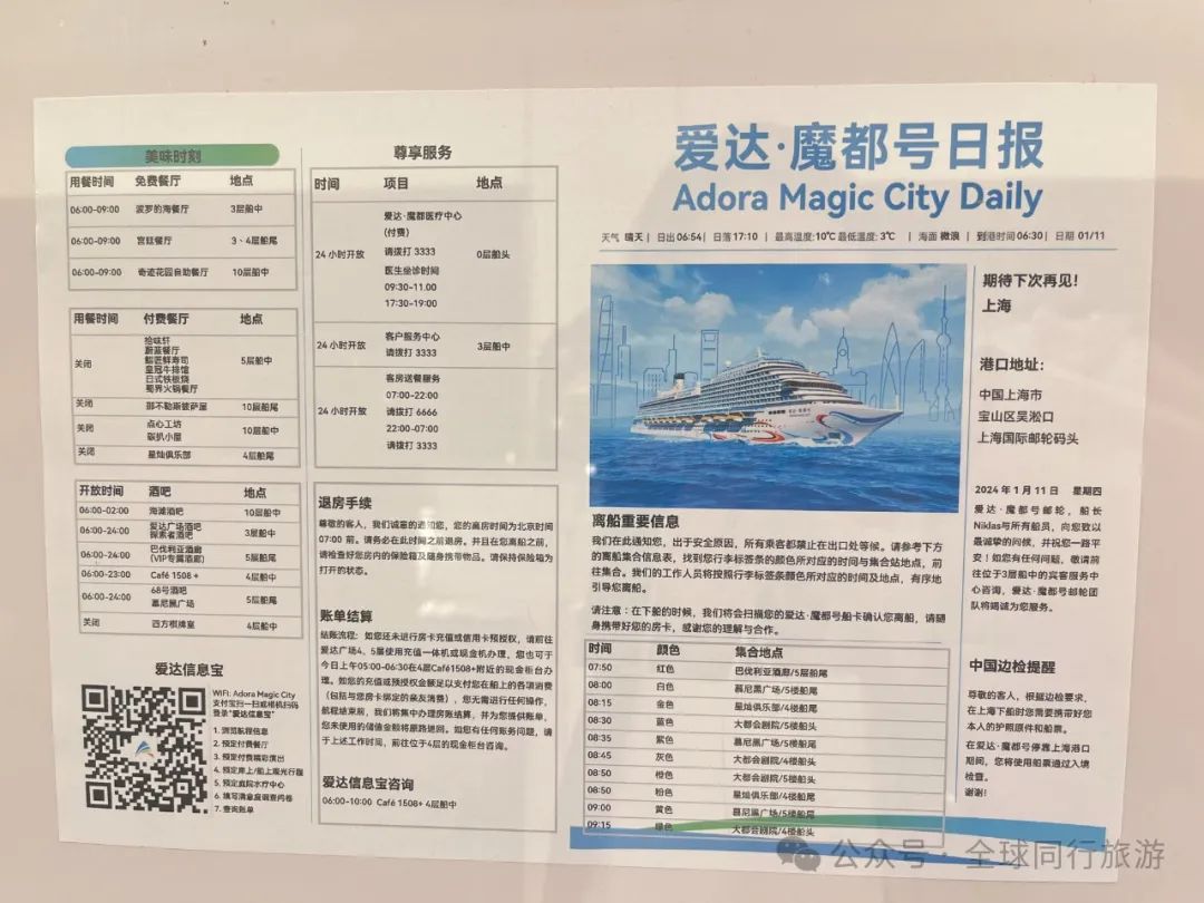 4、魔都日报是每天都会有工作人员发放到房间的,上面有船上的活动时间、用餐时间等船上所有资讯,有了魔都日报可以说是船上的所有行程都尽在掌握,不过每个航次的行程安排时间不同,用餐时间和活动时间也不太一样,大家以自己上船拿到的日报为准,图片jin供参考哦~