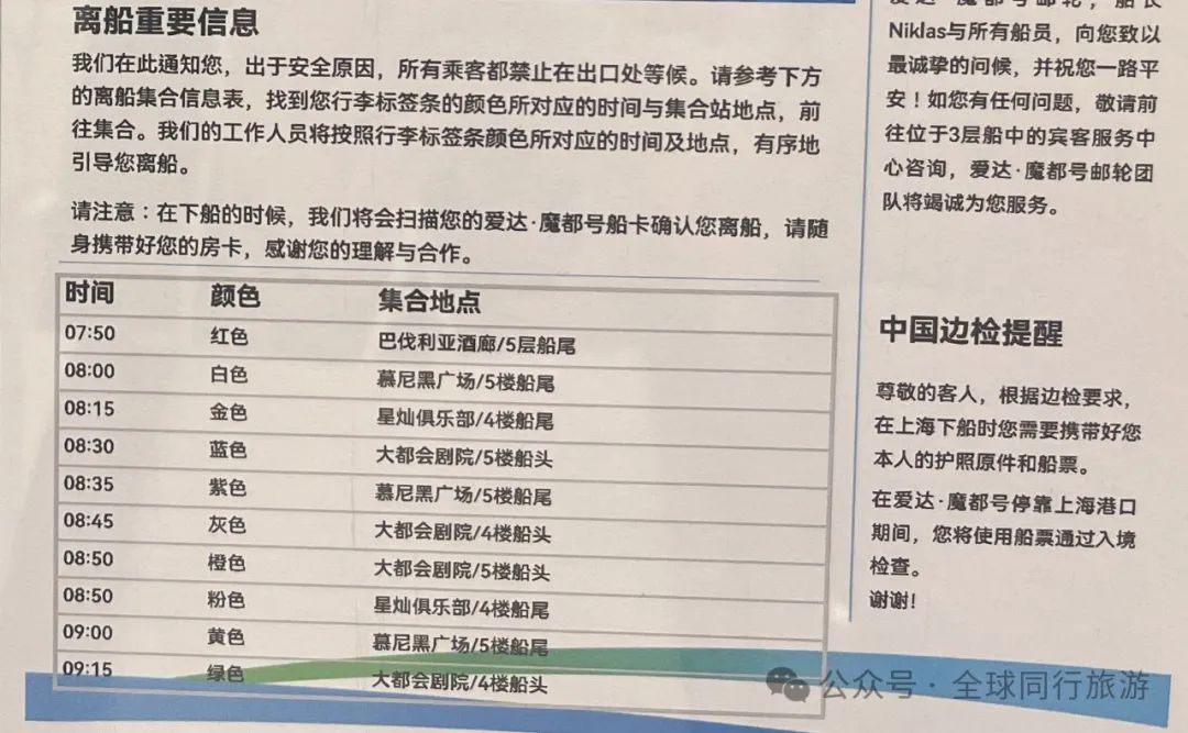 3、下船当天的早餐开餐时间为6:00,大家可以在开餐后,到相应餐厅用餐。公共广播会根据顺序叫颜色,大家记住自己的dai表颜色到相应的ji合地点ji合下船就可以啦~