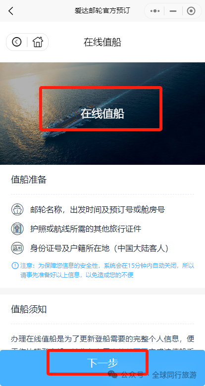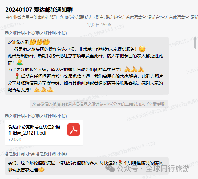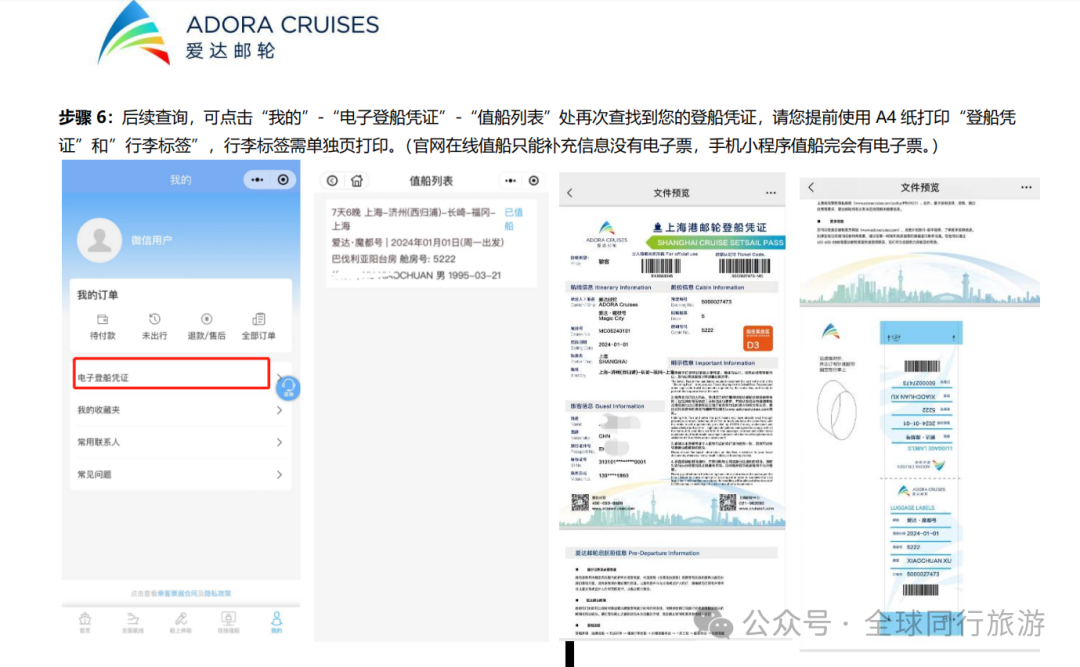 2、出行群里港之旅的工作人员也会发送值船操作指引,教大家在线值船,值船完成后,小程序会直接给大家电子版的船票以及行李标签,大家打印出来保存好,登船的时候更顺畅。