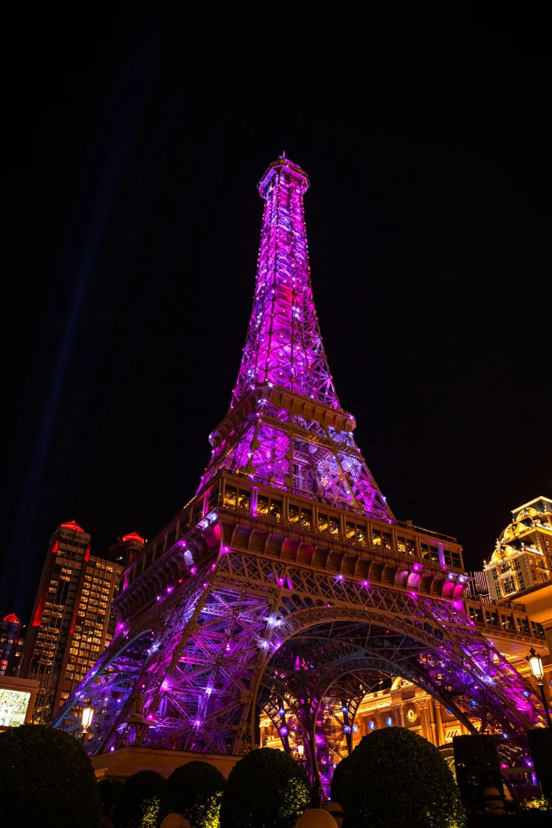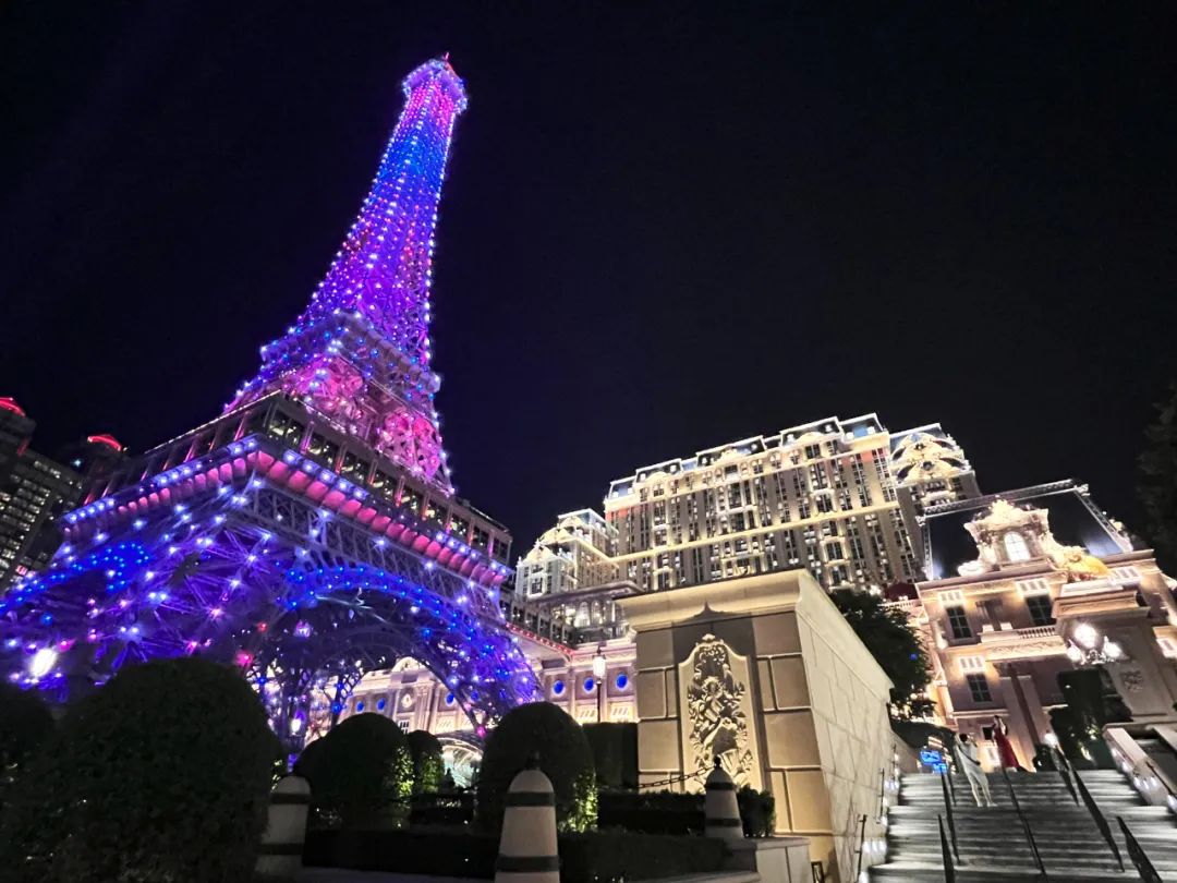 小编在逛完威尼斯人后已经是晚上了,返回时一推开门就看到了华灯初上的巴黎人和伦敦人,从威尼斯人“永恒的白昼”一瞬间进入繁华的人间,那种震撼,让我有一瞬间怀疑我还在不在国内。转眼间,巴黎的埃菲尔铁塔以及英国的大本钟就这么“水灵灵”的呈现在同一个时空里,真的忍不住将眼前的景象都记录下来。