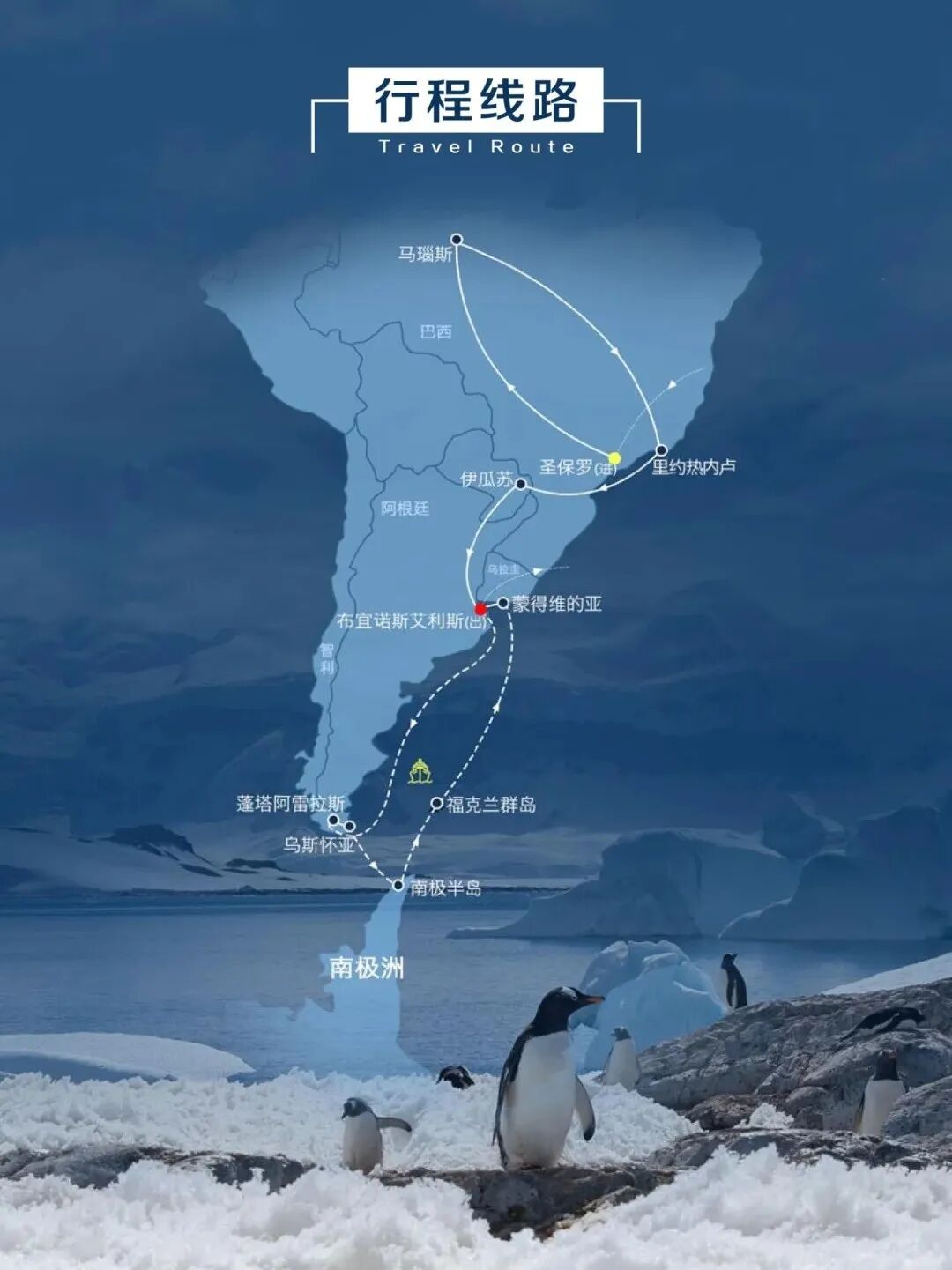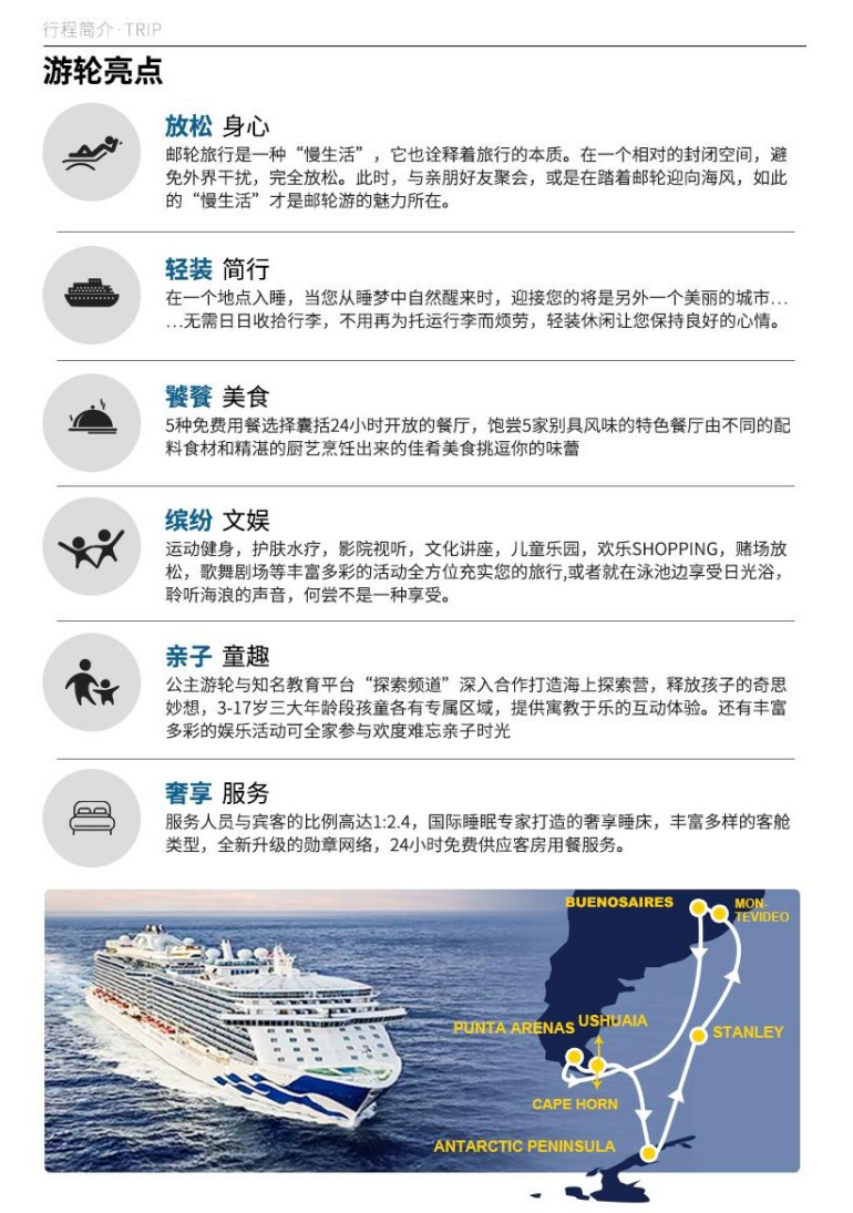 巴西:里约热内卢(景点:伊瓜苏国家公园、耶稣山),圣保罗 布宜诺斯艾利斯:在“南美巴黎”的街头,用一杯马黛茶唤醒冒险基因,看粉色晚霞染红博卡区的铁皮屋。 ⚓️ 乌斯怀亚:在世界zui南端的小镇,登上“世界的尽头”邮局木牌,与南极征程dao计时合影。 ❄️ 穿越德雷克海峡:浪涌如巨兽嘶吼的“魔鬼西风带”,在邮轮的破冰级稳定系统下,化作一场略带刺激的摇篮曲。 当di一座幽蓝冰山浮出海面,当企鹅的啼叫穿透极地寒风,南极的魔幻之门轰然开启。 蓝宝石公主号不仅是交通工具,更是一座移动的极地乌托邦。 全景玻璃穹顶观景廊:手捧热可可窝在沙发里,窗外冰山漂流,座头鲸突然跃出海面,引发全场欢呼。 随船海洋生物学家每日开讲,从磷虾生态到冰川形成,让探险不止于惊叹。零下20℃的寒风中泡进甲板恒温泳池,看极光般流动的晚霞(南极光偶遇彩蛋!)主厨以蓝、白、银为灵感打造“冰山料理”,帝王蟹佐液氮冷雾,舌尖与眼睛同时醉倒。 智利峡湾:邮轮蜿蜒穿过雨林与雪峰交织的峡湾,偶遇麦哲伦企鹅在苔原上蹒跚。 蒙得维的亚:可以在美丽的普拉多公园、Batlle yOrdonez 公园和棕榈树成荫的du立广场停下来拍照留念。优雅的立法宫,它被认为是世界上zui美丽的三座立法建筑之一。沿着海滨兰布拉大道(La Rambla)驾车行驶,欣赏蒙得维的亚令人惊叹的海滩美景。
