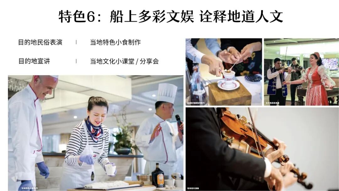 ⑥船上多彩文娱,诠释地道人文。目的地民俗表演当地特色小食制作,目的地宣讲,当地文化小课堂/分享会