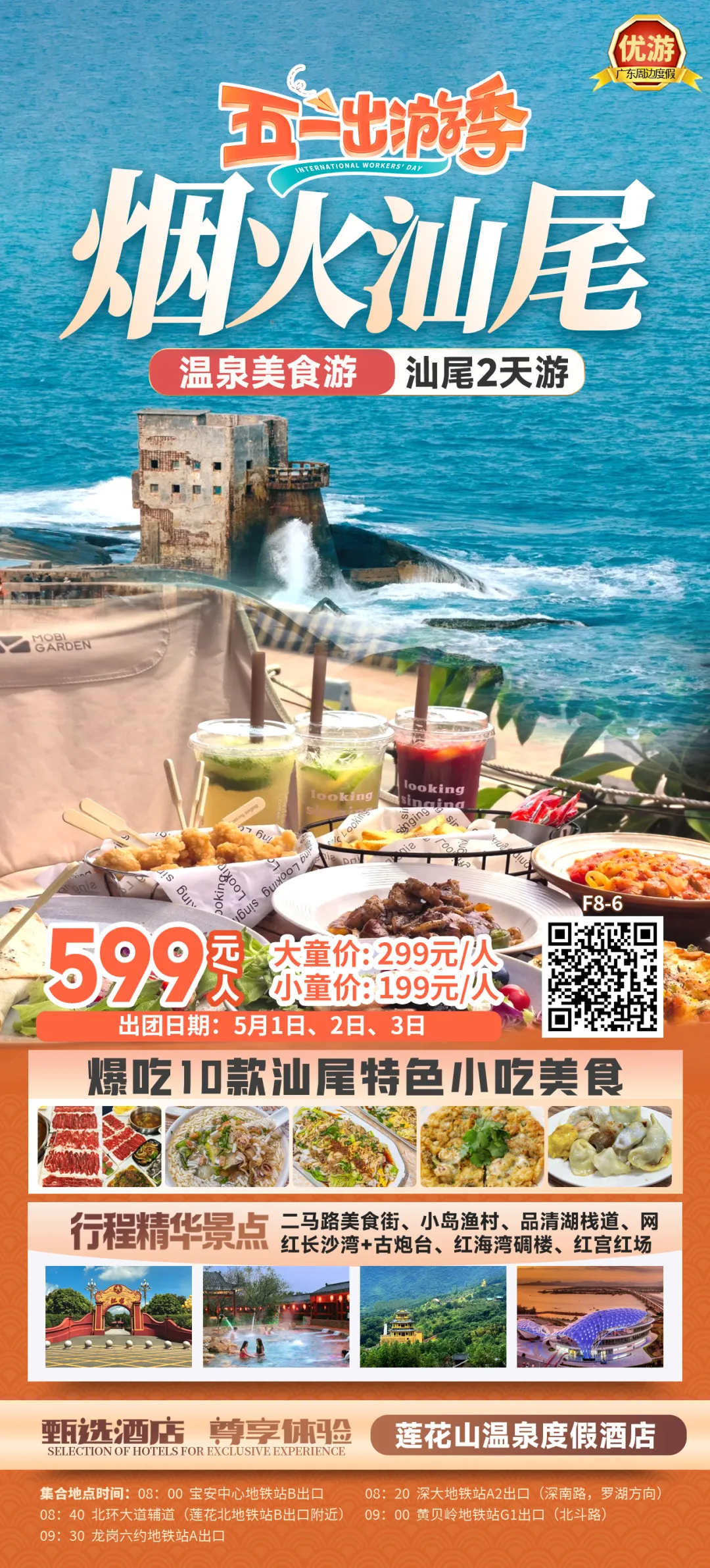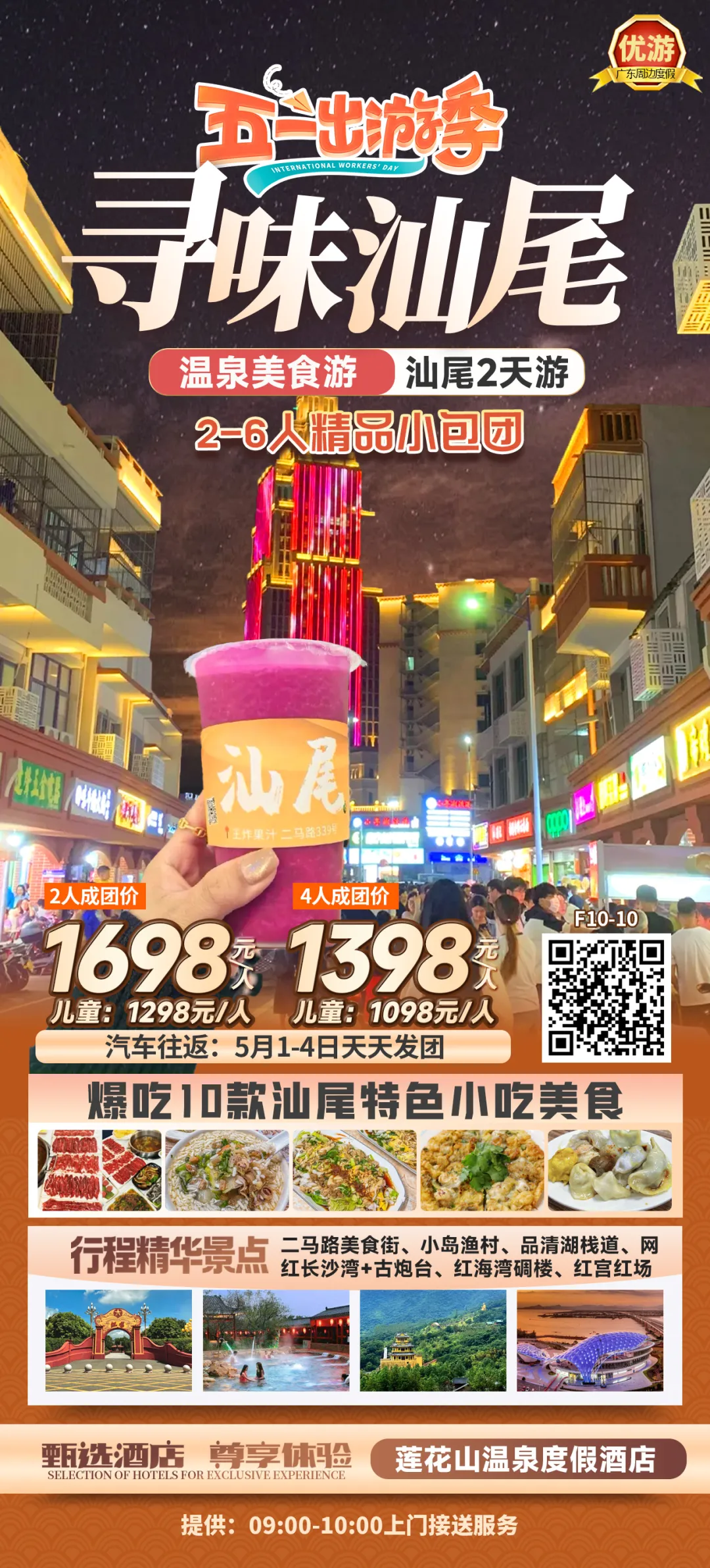 景点:红海湾(海滨风光)、金町湾(沙滩度假)、凤山祖庙(妈祖文化)。