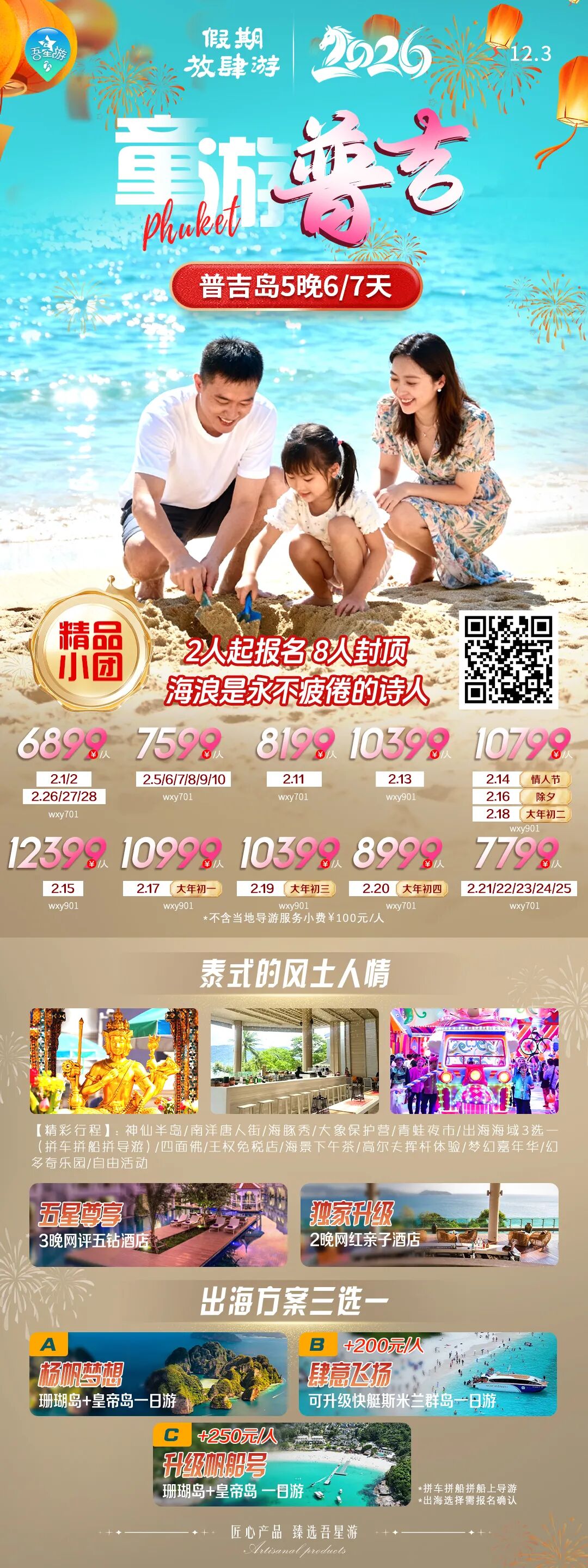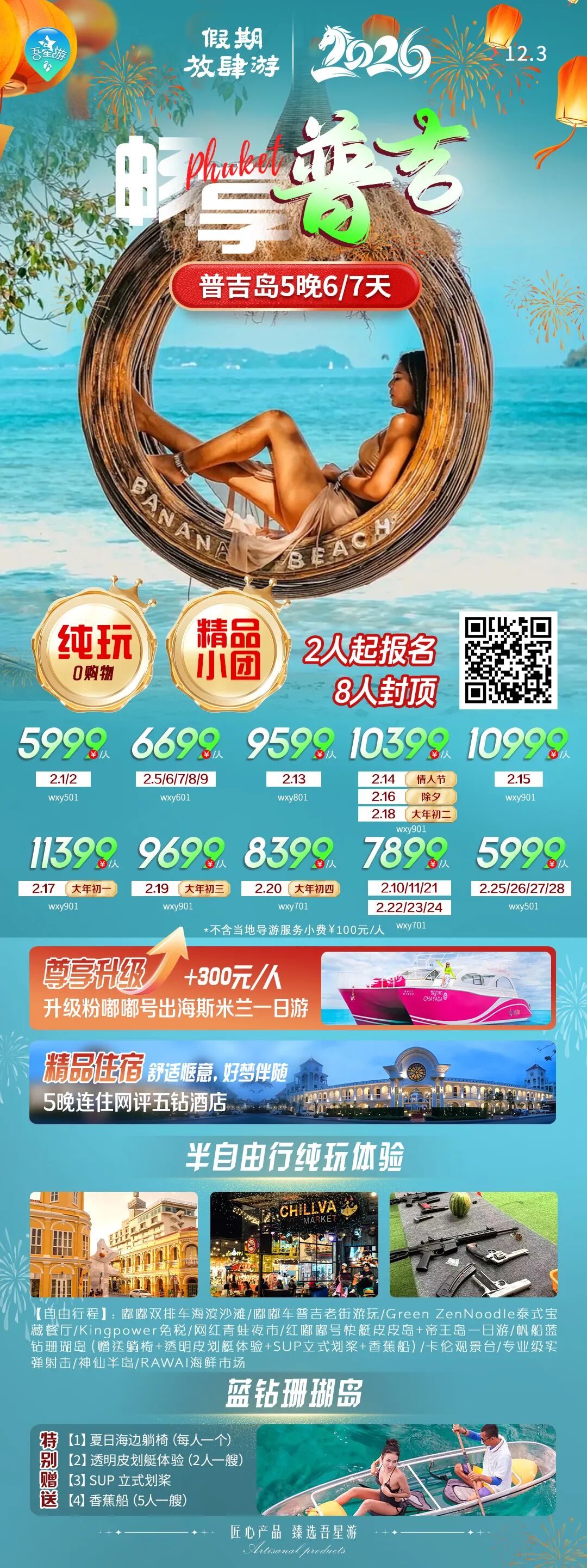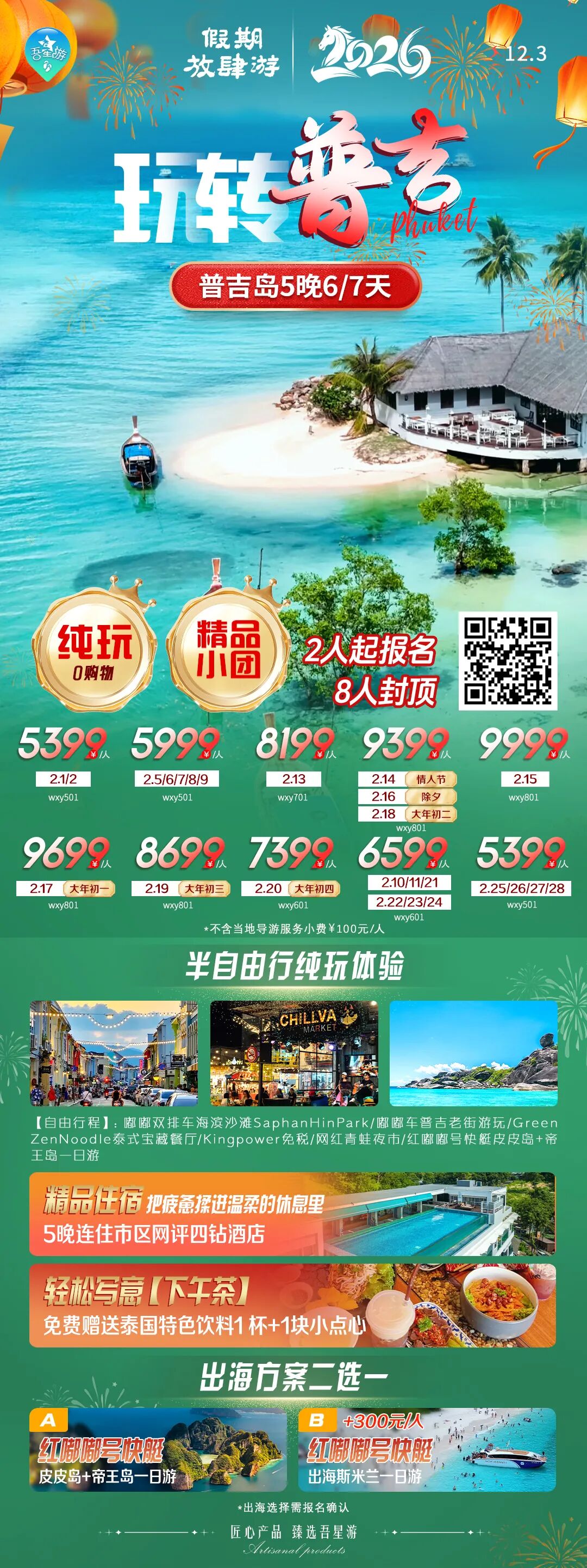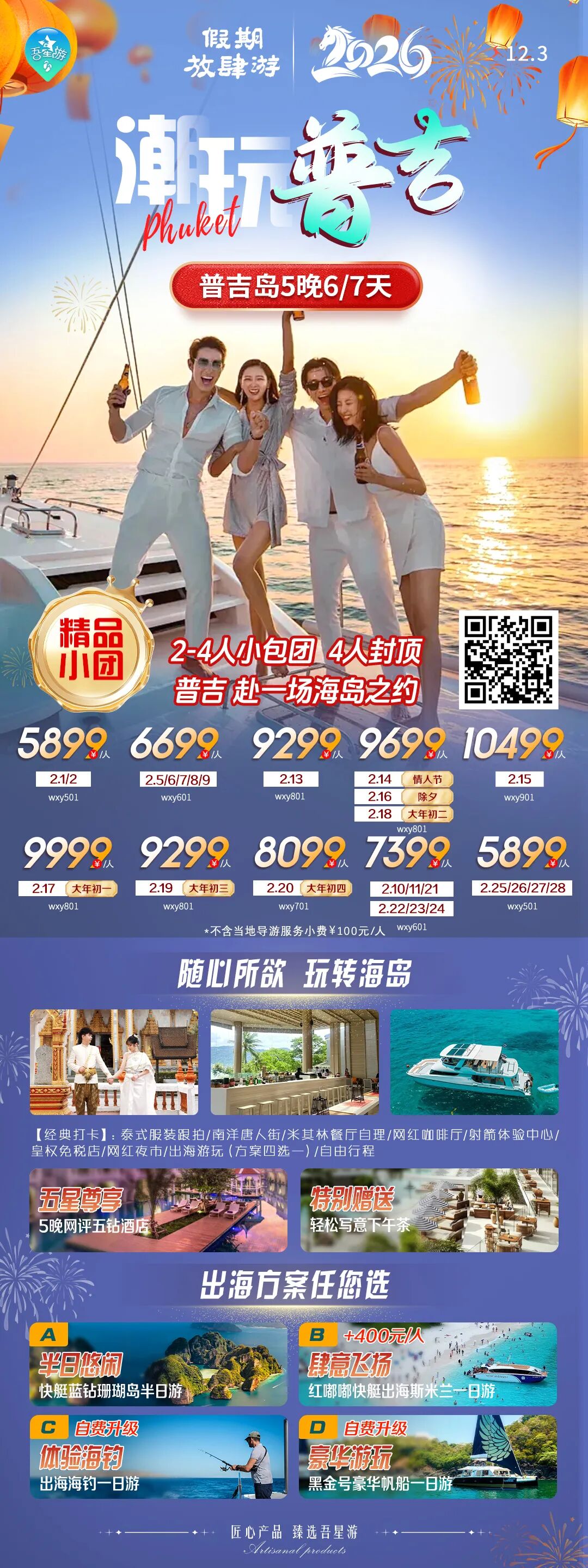 【玩转普吉 】 普吉岛5晚6/7天 纯玩0购物 2人起报名 8人封顶 5晚连住市区网评四钻酒店 半自由行纯玩体验 轻松写意【下午茶】:免费赠送 泰国特色 饮料1杯+1块小点心 出海选择 需 报名即确认 A:快艇出海PP岛+帝王岛一日游 B:+300元/人升级粉嘟嘟号出海斯米兰一日游【畅享普吉】普吉岛5晚6/7天 纯玩 0购物 2-8人小包团 +300元/人升级粉嘟嘟号出海斯米兰一日游 5晚连住网评五钻酒店 半自由行纯玩体验,跟团游的超性价比价格 帆船蓝钻珊瑚岛(赠送躺椅+透明皮划艇体验+ SUP立式划桨+香蕉船)【潮玩普吉 】普吉岛5晚6/7天 2-4人小包团,4人封顶 5晚网评五钻酒店 经典打卡:南洋唐人街+青蛙夜市 特别赠送:轻松写意下午茶,网红咖啡厅悠闲品尝泰国特色饮料点心。 自由自在:特别安排两天自由活动,随心所欲,玩转海岛 出海任选: A:快艇蓝钻珊瑚岛半日游(拼车 拼船 拼导) B:+400元/人 红嘟嘟快艇出海斯米兰一日游 (拼车 拼船 拼导) C:【可自费升级】出海海钓一日游 (拼车 拼船 拼导) D:【可自费升级】网红黑金号Black Wing@皇帝岛+珊瑚岛+蜜月岛 豪华帆船 一日游【童游普吉】 普吉岛5晚6/7天 2人起收 8人小包团 3晚网评五钻酒店+后2晚升级网红亲子酒店 海豚秀/大象保护营/神仙半岛/梦幻嘉年华/欢多奇/高尔夫 出海3选1 A线:快艇珊瑚岛+皇帝岛一日游 B线:+200元/人可升级快艇斯米兰群岛一日游 C线:+250元/人可升级大白号/伊丽莎白号/红小姐号帆船珊瑚岛+皇帝岛一日游添加上方微信客服预约咨询或进入官方福利群领取更多福利