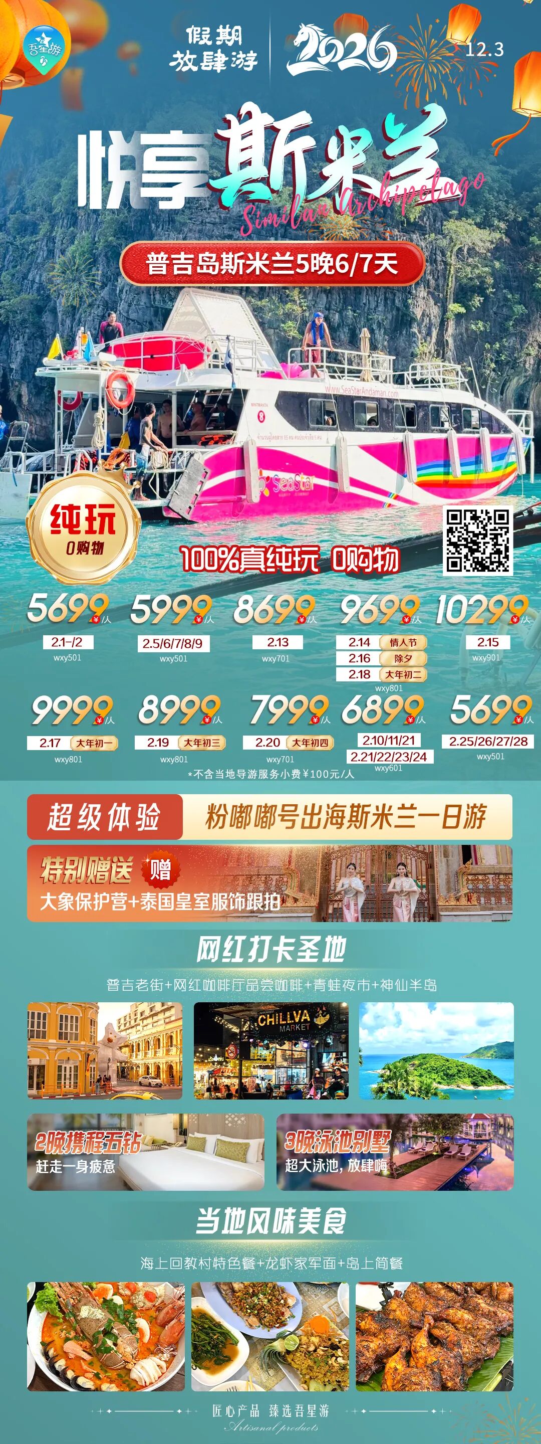 【悦享 斯米兰】 普吉岛斯米兰5晚6/7天 纯玩0购物 超级体验:粉嘟嘟号出海斯米兰一日游 五钻美宿:3晚泳池别墅+2晚携程五钻 特别赠送:大象保护营+泰国皇室服饰跟拍 风味美食:海上回教村特色餐+龙虾家军面+岛上简餐 网红打卡:普吉老街+网红咖啡厅品尝咖啡+青蛙夜市+神仙半岛