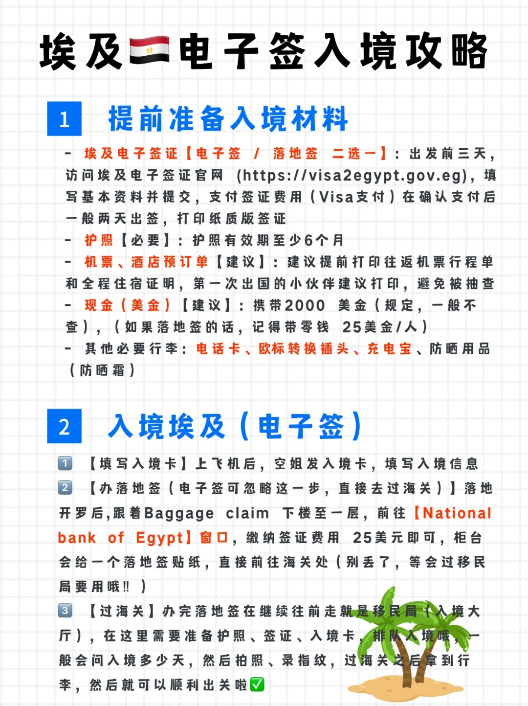 签证办理:持外交护照、公务护照中国公民可免签入境埃及,持其他种类护照人员须办理签证。中国公民持有效期 6 个月以上护照可办理落地签入境,但需在出发前通过埃及邀请方或旅行社办妥并向埃及移民局备案,以免入境受阻;获批准者可自开罗、亚历山大、霍尔格达、沙姆沙伊赫和卢克索入境,停留期为 30 天,需交纳 15 美元签证费 。也可提前在国内办理贴纸签证,准备有效期至少 6 个月的护照、护照照片 2 张、签证申请表(用英文大写填写并签名)、邀请信原件、中方单位派遣函英文原件、资金能力证明类文件及其他支持文件,向辖区内的相关使领馆递交签证申请,交纳签证费,一般出签时间在 10 个工作日左右 。