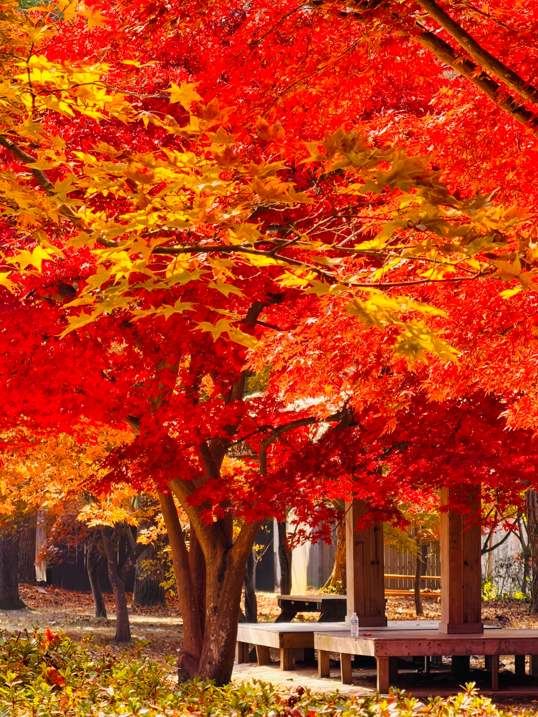 景福宫:穿越时空的枫情画卷 韩国的“故宫”,红墙碧瓦与秋日枫叶的完美邂逅,10 月下旬至 11 月初,勤政殿前的枫树换上橙红新装,阳光洒下,每一步都是复古大片。早起打卡避开人潮,周圈很多借穿韩服的店铺可以去租借一身行头,一秒穿越回朝鲜时代。 Tips: 每周二闭馆不要跑空哦! 地址:首尔特别市钟路区社稷路161(서울특별시종로구사직로161)地铁3号线景福宫站 4号出口 ⏰时间:11-2月9:00-17:00(最后入场16:00);3-5月/9-10月9:00-18:00(最后入场17:00);6-8月9:00-18:30(最后入场17:30),赏枫期10月中-11月中