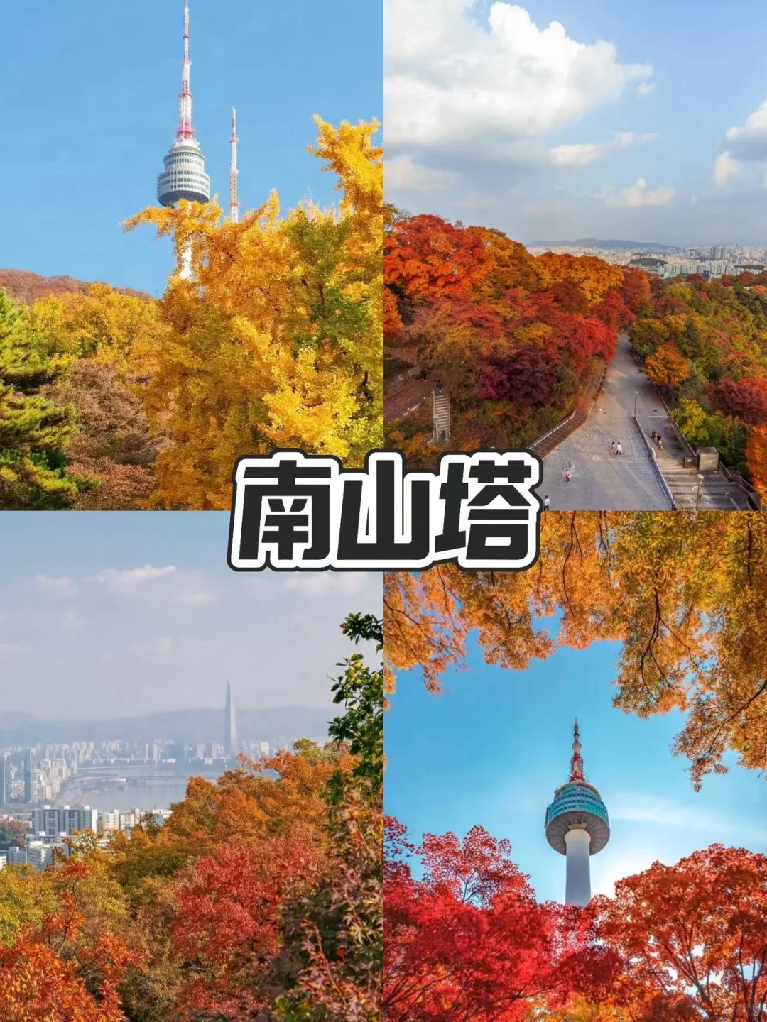 南山公园:首尔的秋日明信片 N 首尔塔的红色塔身与满山红叶,是首尔秋天的招牌画面。从“明洞”搭缆车上去,一路枫海相伴,山顶的“南山循环步道”更是宝藏路线,“八角亭”那,红叶与塔尖同框,出片率超高! 地址:首尔特别市中区三一大路231(서울특별시중구삼일대로231)地铁4号线至明洞站,4号出口步行10分钟,转乘「南山索道」至N首尔塔/乘搭「南山循环巴士」01号或8001号(周末路线)至「N首尔塔」站 ⏰时间:24小时开放,赏枫期10月中-10月底