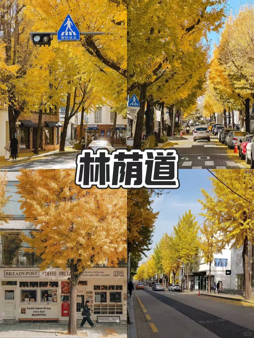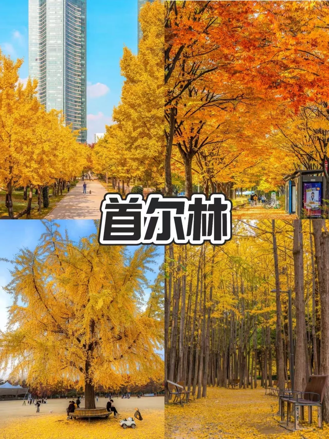 首尔林:城市里的秋日童话 首尔最大的城市生态公园,秋季的“银杏大道”和“枫香林”美得不像话。来自星星的你取景地,11 月初,枫香树变成橙红色,浪漫爆表。周末去,还能看到草坪上野餐的人群,分分钟拍出韩剧同款! 地址:首尔城东区纛岛路273(서울 성동구 뚝섬로 273)水仁盆唐线首尔林站 5 号口,直接进公园 ⏰时间:24小时开放,赏枫期10月中-11月初 新沙洞林荫道:赏银杏的最佳地点 有了秋天银杏的林荫道才是精髓,这边不仅能赏秋,还有各种潮牌,比如Tamburins,Gentle monster,grove,lelabo,nonfiction这些一边city walk一边沿路就能逛完 地址:首尔江南区新沙洞667-13(서울 강남구 신사동 667-13)地铁 3 号线新沙站 8 号口,沿林荫道往狎鸥亭方向走!⏰时间:24小时开放,赏枫期10月中-11月初时开放,赏枫期10月中-11月初