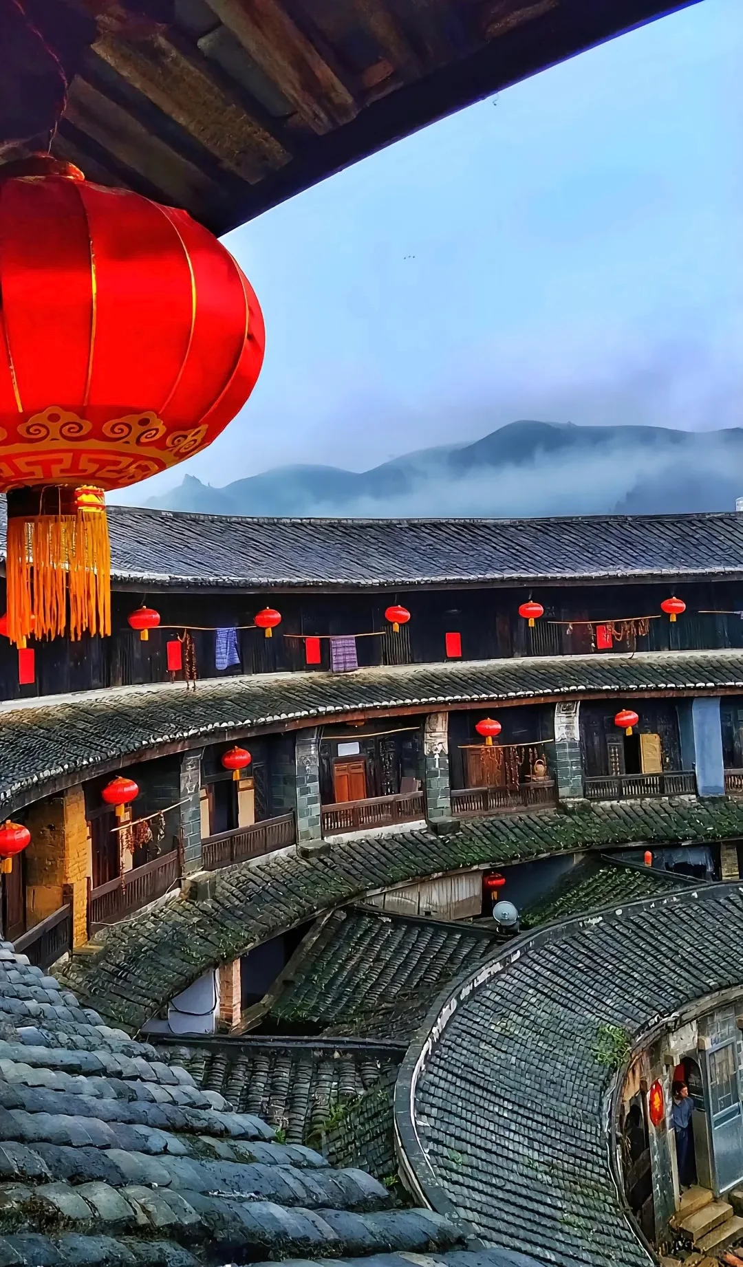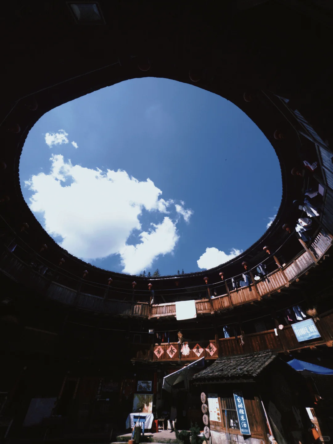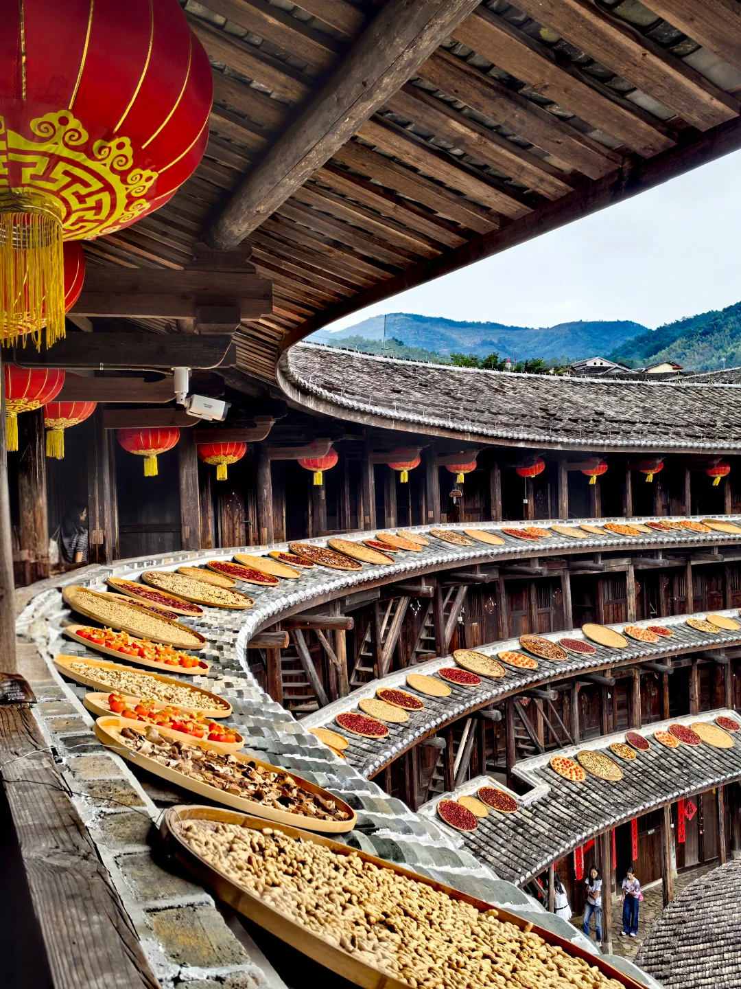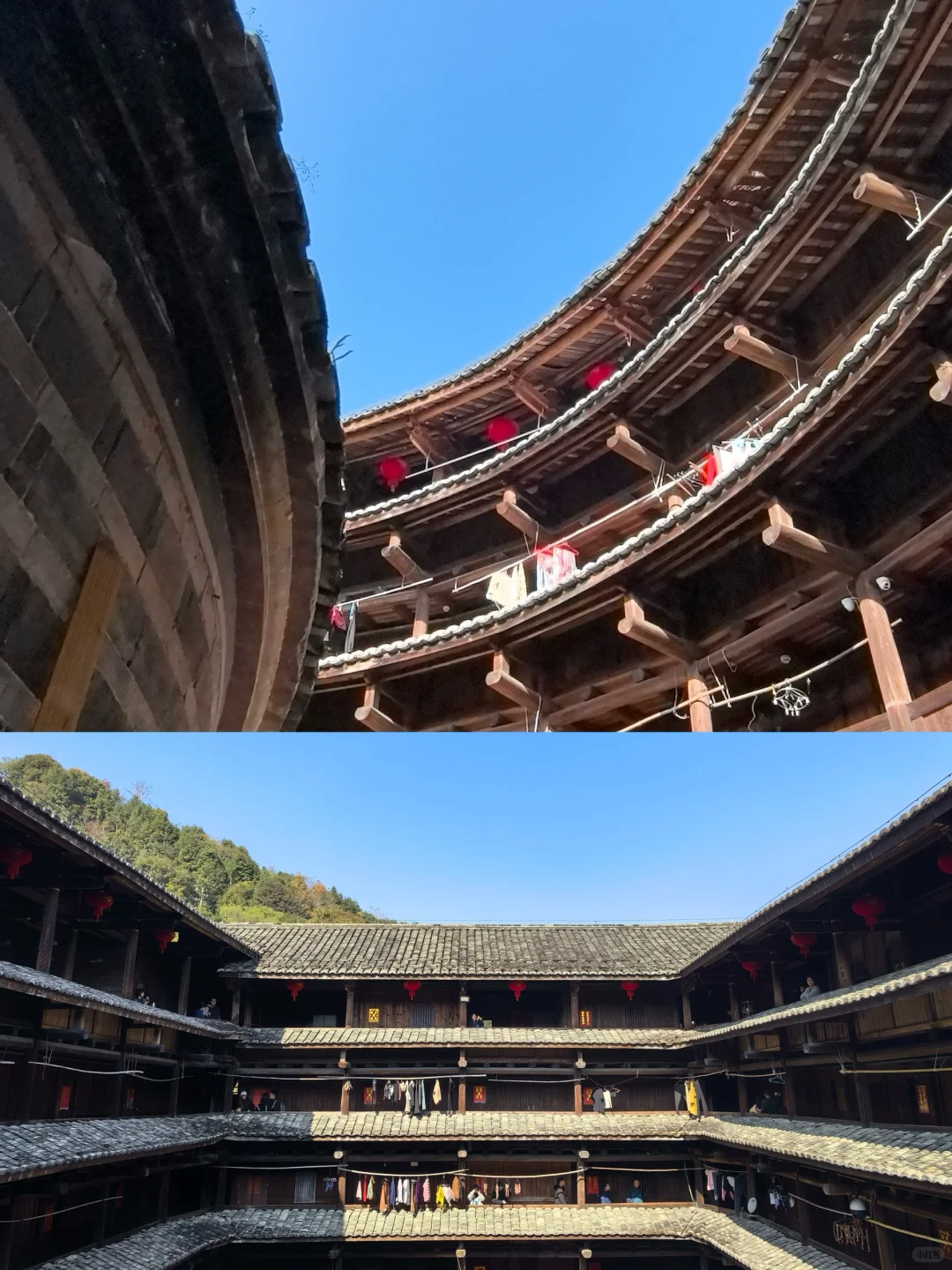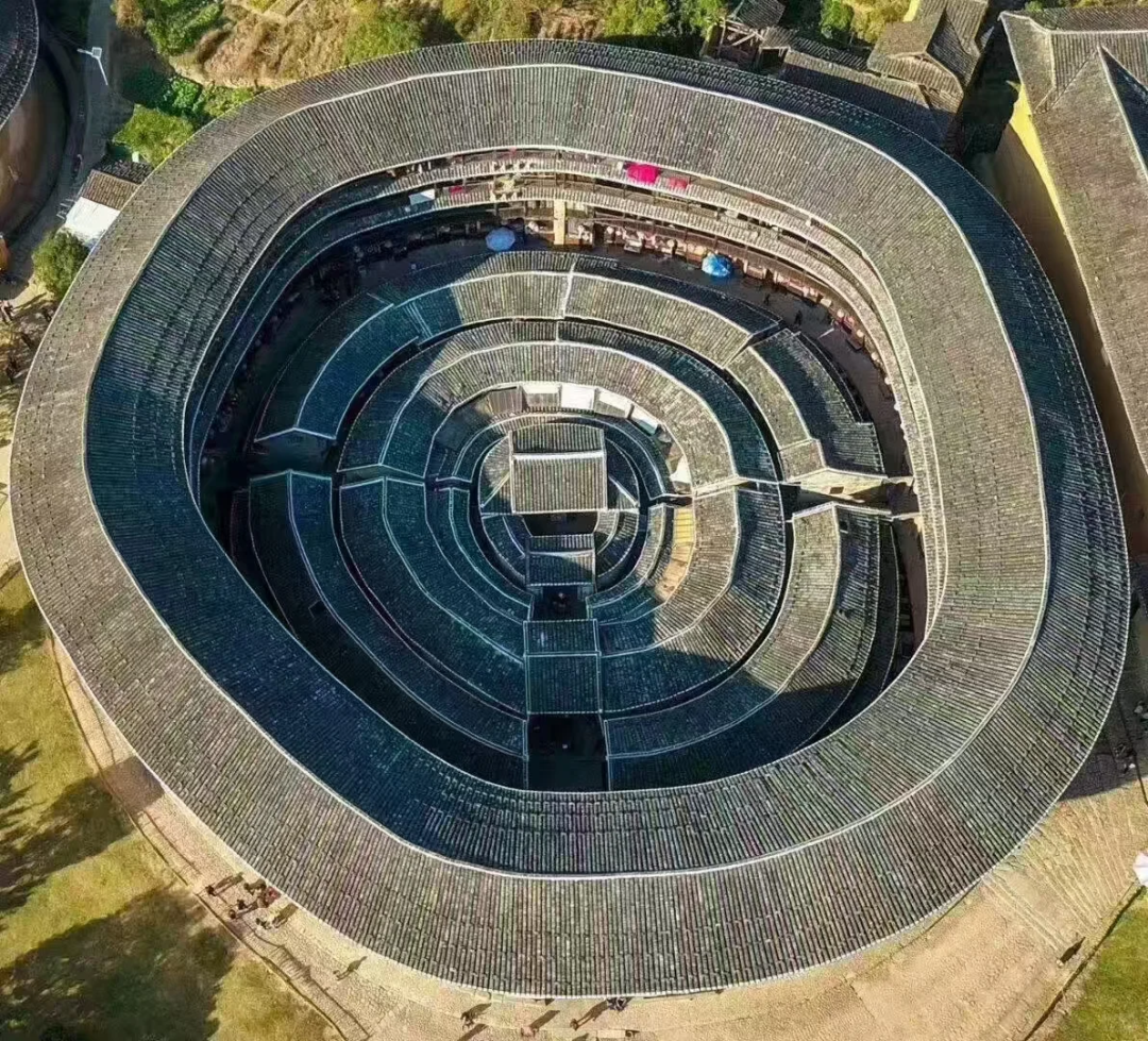 午餐后,正式开启土楼探秘之旅 。首先来到高贵典雅的土楼之王 —— 承启楼 。这座土楼从明崇祯年间破土奠基,历经 3 代人,直到清康熙年间才竣工,整整花了半个世纪 。它规模巨大,直径达 73 米,走廊周长 229.34 米 。共有 4 环,外环 4 层,拥有 400 个房间 。整座楼按照易经八卦布局,就像一座神秘的城堡 。1986 年,它还被印在了中国邮电部发行的 “中国民居” 邮票上,被称为 “圆楼之王” 。走进承启楼,仿佛穿越回了古代 。外环楼靠外版筑墙的出檐距离约两米之远,这种独特的出檐方式可以保护版筑墙不受雨水侵蚀 。外环楼靠内部走廊上挑盖有腰檐,能保护木构件 。梁柱结构也很有特色,内廊采用不着地悬挑的柱结构,与后部的步架结构形成一个牢固的框架体系 。厨房的木直棂窗没有窗扇,既保证了房间良好的通风与采光,下部空间还能作碗橱使用 。楼内各环的巷道大多用鹅卵石铺设,二、三、四环房屋之间的通道与各环的巷形成 T 字形的铺设格局,有利于雨水的排放与渗透,避免楼内积水 。