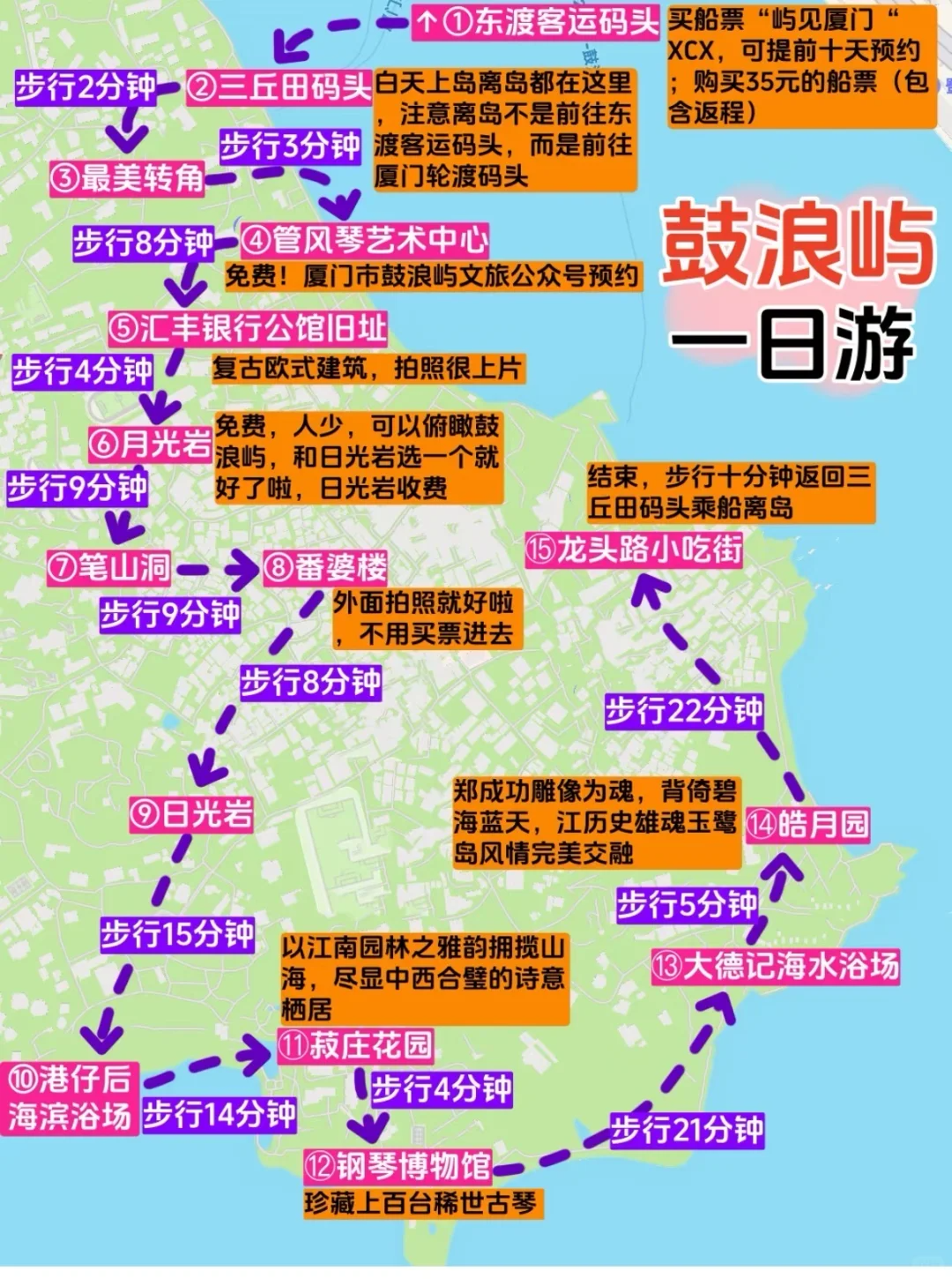 之后,根据轮渡票时间搭乘轮渡前往充满文艺气息的鼓浪屿 。鼓浪屿素有 “海上花园・钢琴岛・步行岛” 之称,是国家 5A 景区 。岛上四季如春,无车马喧嚣,只有鸟语花香,漫步其中,仿佛置身于世外桃源 。这里音乐人才辈出,钢琴拥有密度居全国之冠,因此又有 “钢琴之岛”“音乐之乡” 的美名 。