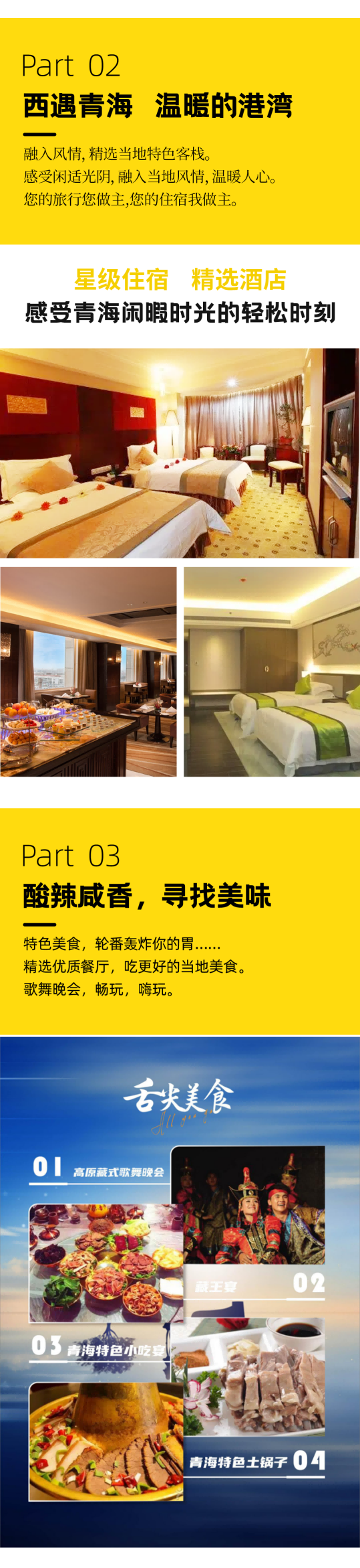 您还可以品尝到许多当地的美食。比如,藏王宴、青海特色土锅子等,这些都是青海地区的特色美食,口感独特,让您回味无穷。