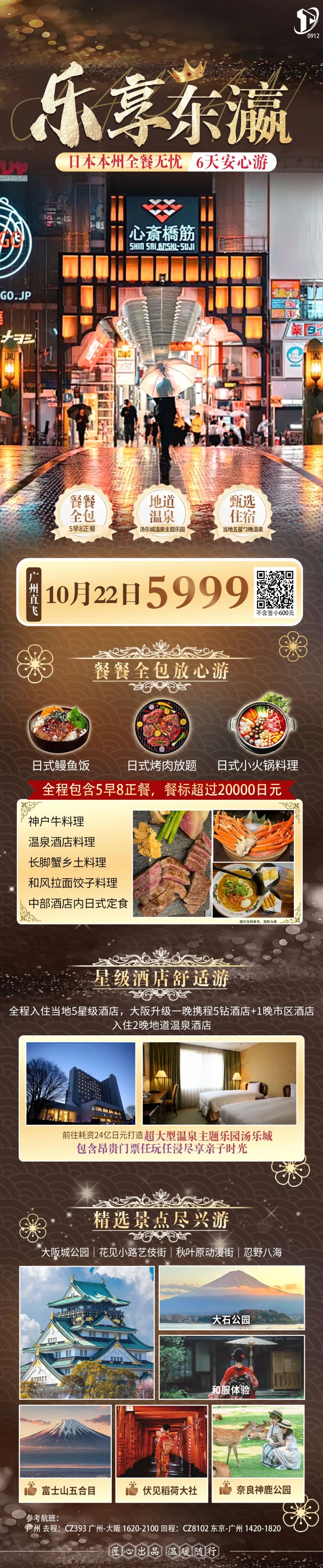入住当地5星舒适酒店+2晚露天温泉酒店+2晚大阪旺区连住